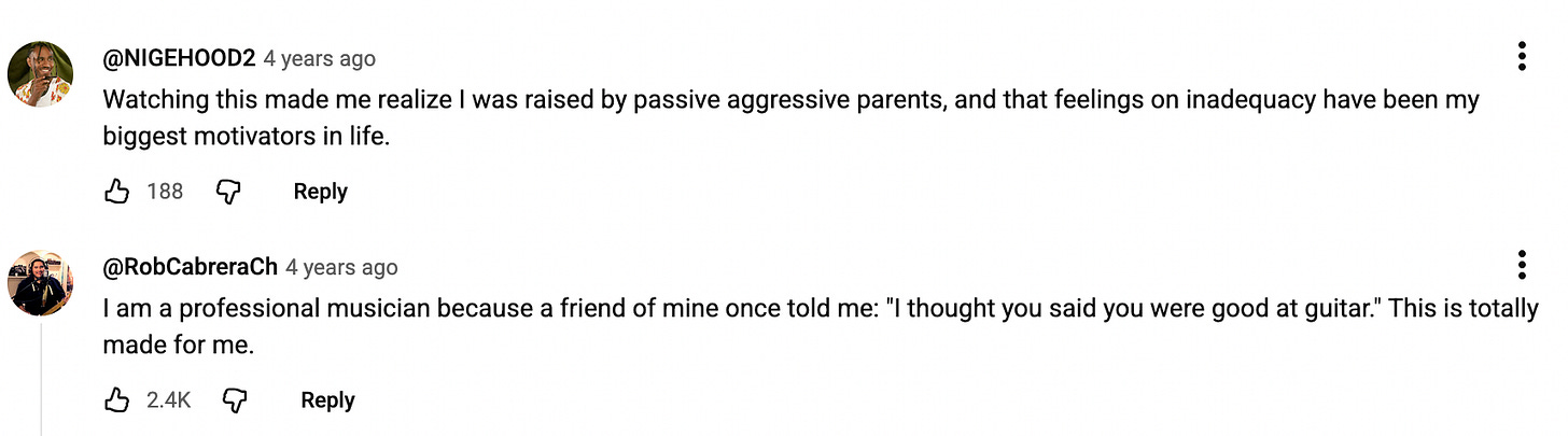 And yet, this kind of talk, the negative kind, can be a motivator (for good or bad). It inspires us to reach for something. The comments under the video are almost all related to how this actually would work for them and how they distrust praise and cheerleading.