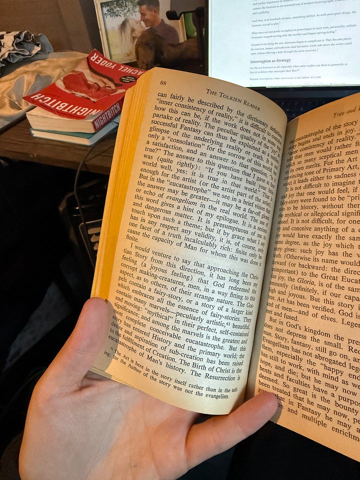 You can see similar impulses in other novels. In the work of Tolkien’s The Silmarillion, The Tolkien Reader, and even The Lord of the Rings trilogy, itself, footnotes and appendices function as world-building. They simulate history. They give the impression that the story existed long before we arrived, complete with genealogies, myths, and marginalia that make the fiction feel discovered rather than invented.