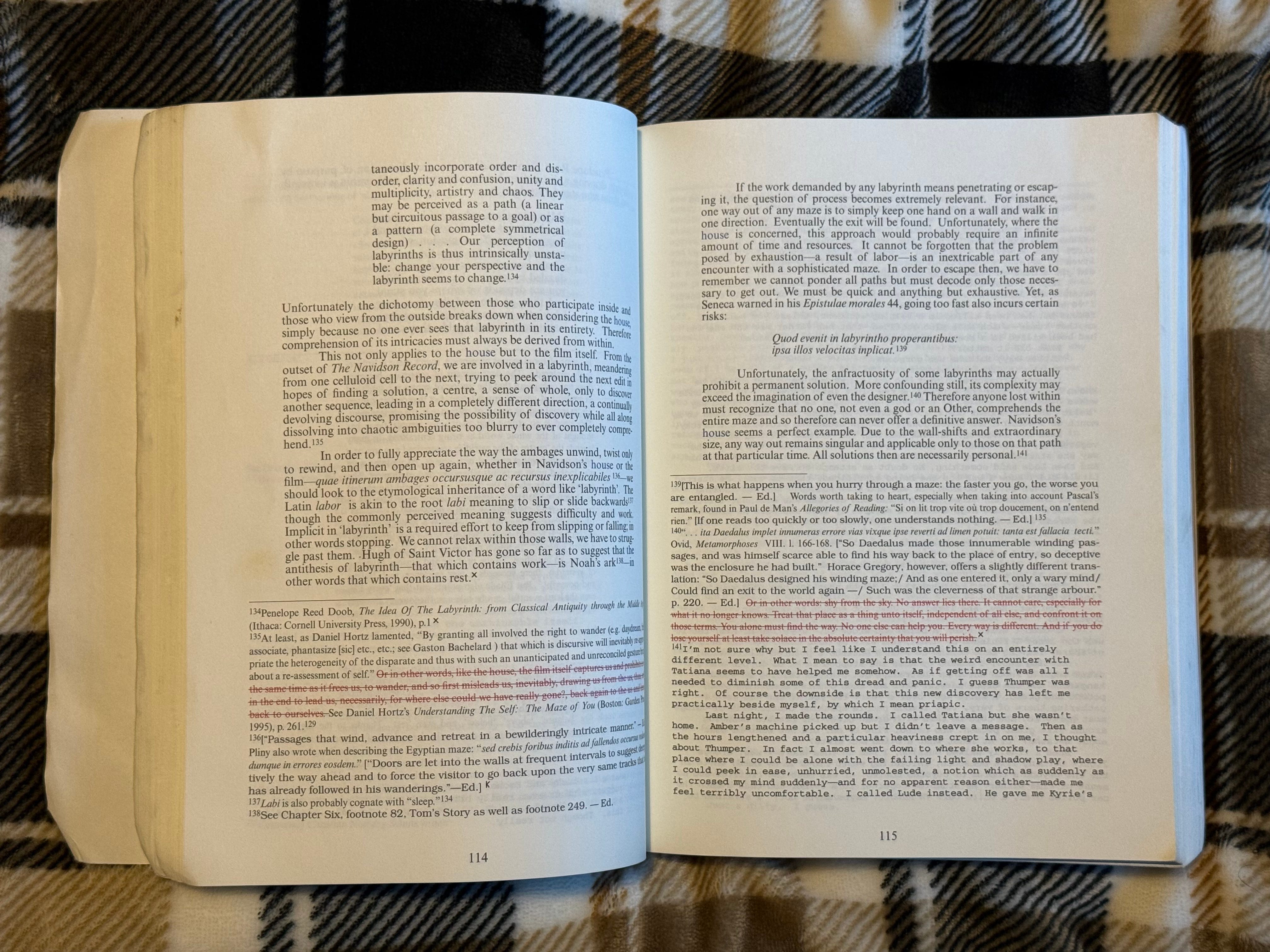Why do I love it? Well, to be as basic as possible in explaining what this book is, without giving anything away, I’d say: it is a paranormal maze within a horror maze within a deeply evocative, emotionally gripping maze.⁵ The book uses footnotes, endnotes, appendices, indexes, and typographic play to create multiple narrative layers that literally bleed into one another. The text becomes a physical experience you can’t ignore. Reading it requires movement, choice, and attention.