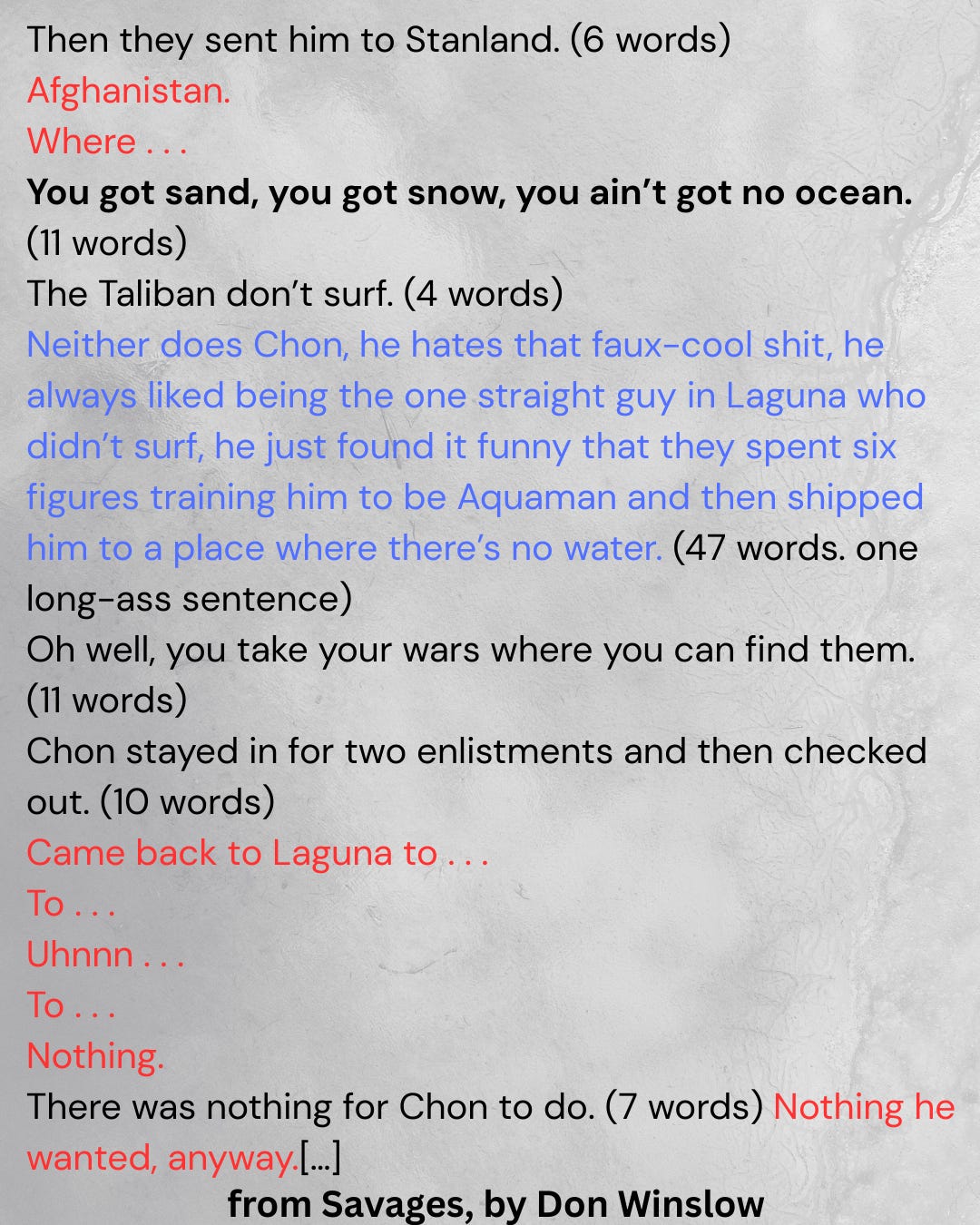 I am NOT SAYING Don Winslow is selling something cheap, I’m saying both forms understand how language behaves under pressure.